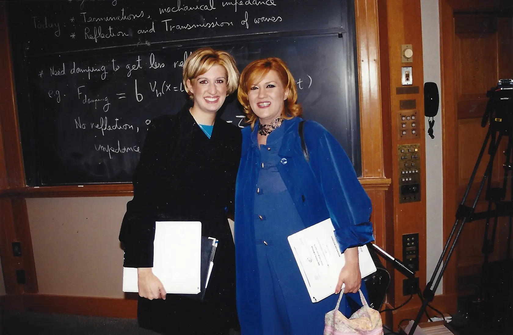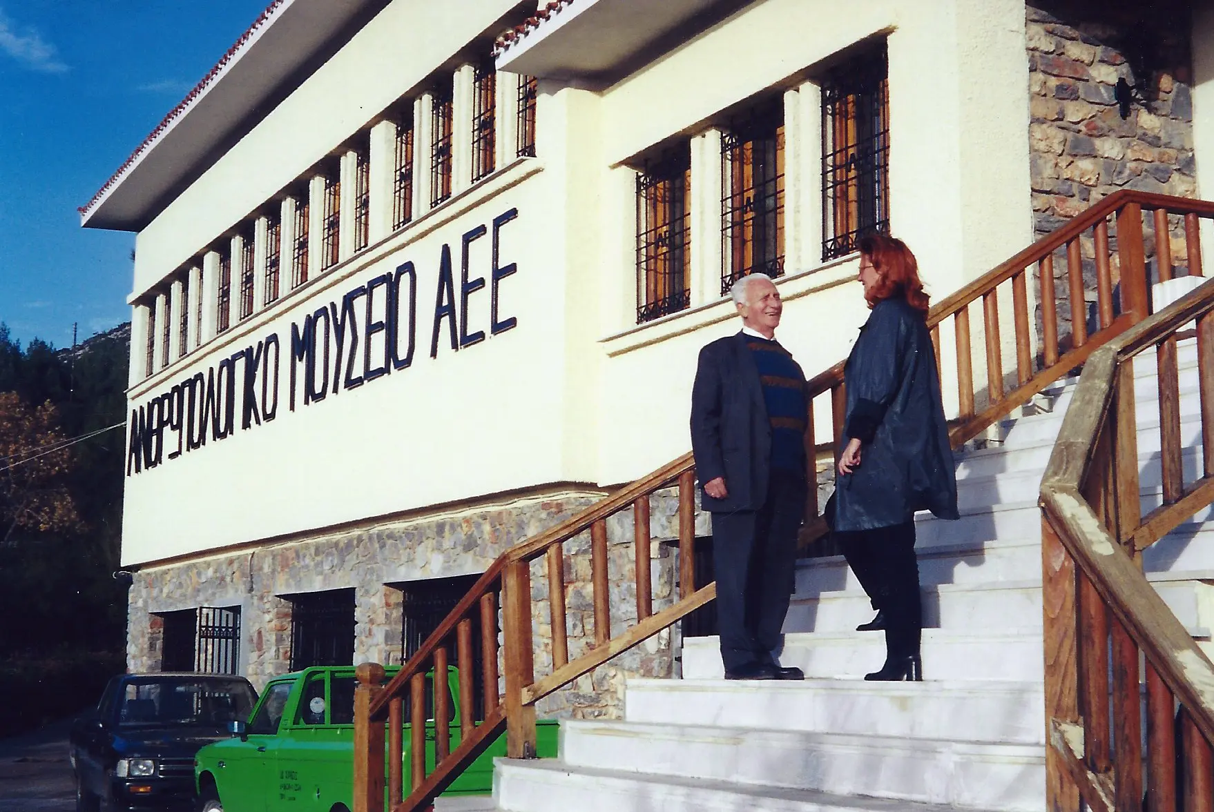 Two individuals speaking at a conference with Greek signage behind them. Two women smiling, holding notebooks, standing in front of a chalkboard. A man speaks into a microphone at a conference or meeting. Three professionally dressed people posing indoors.