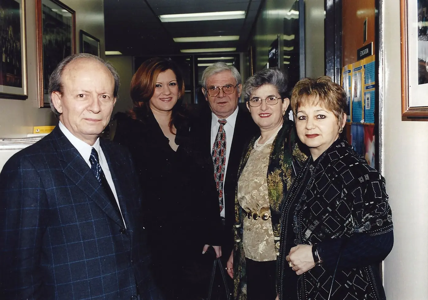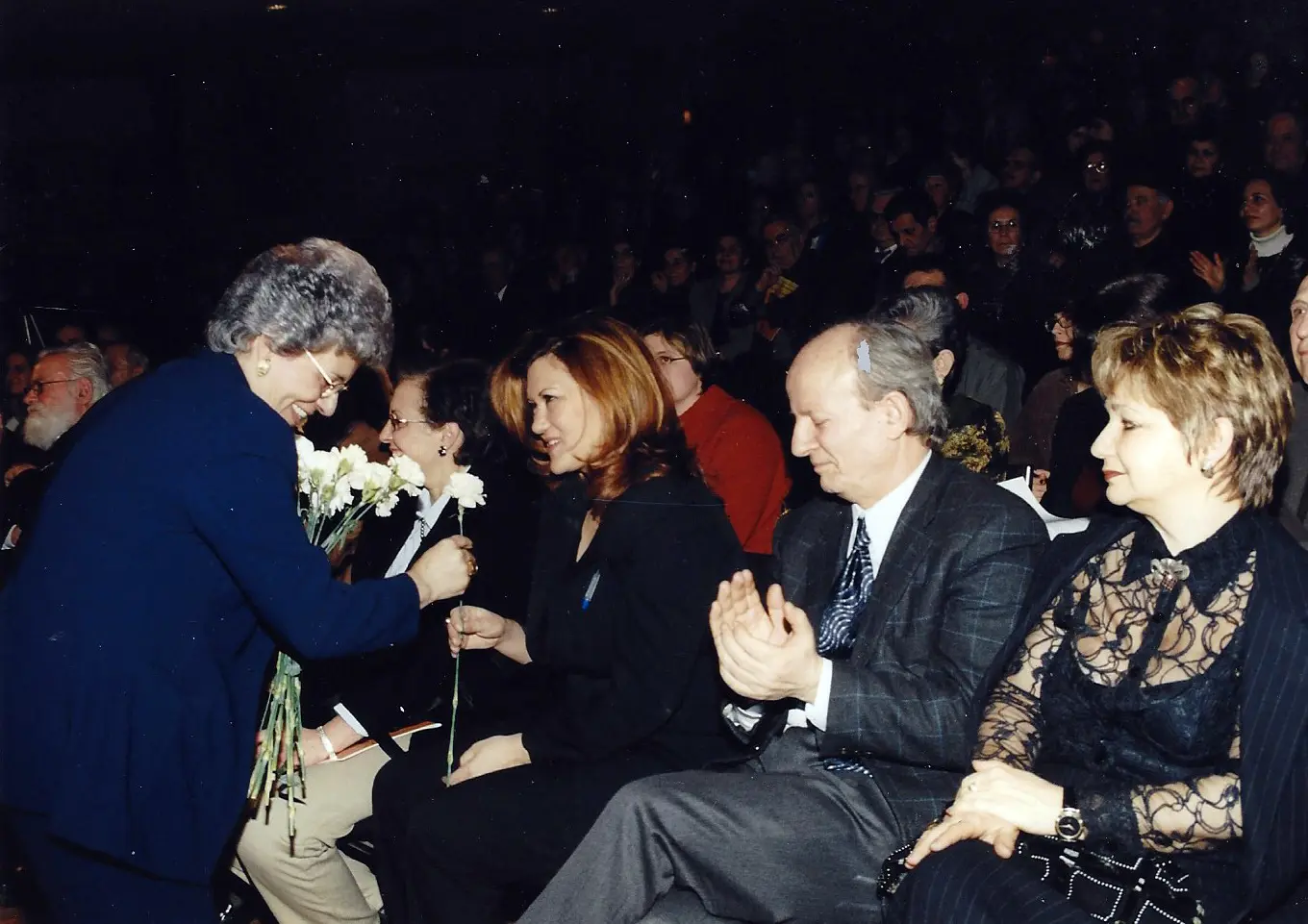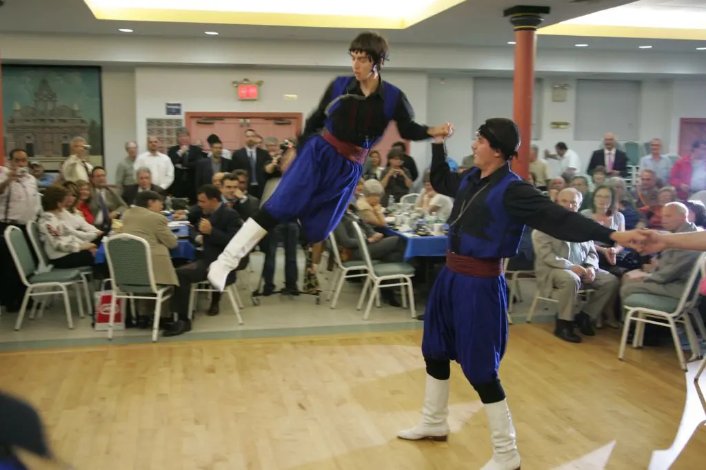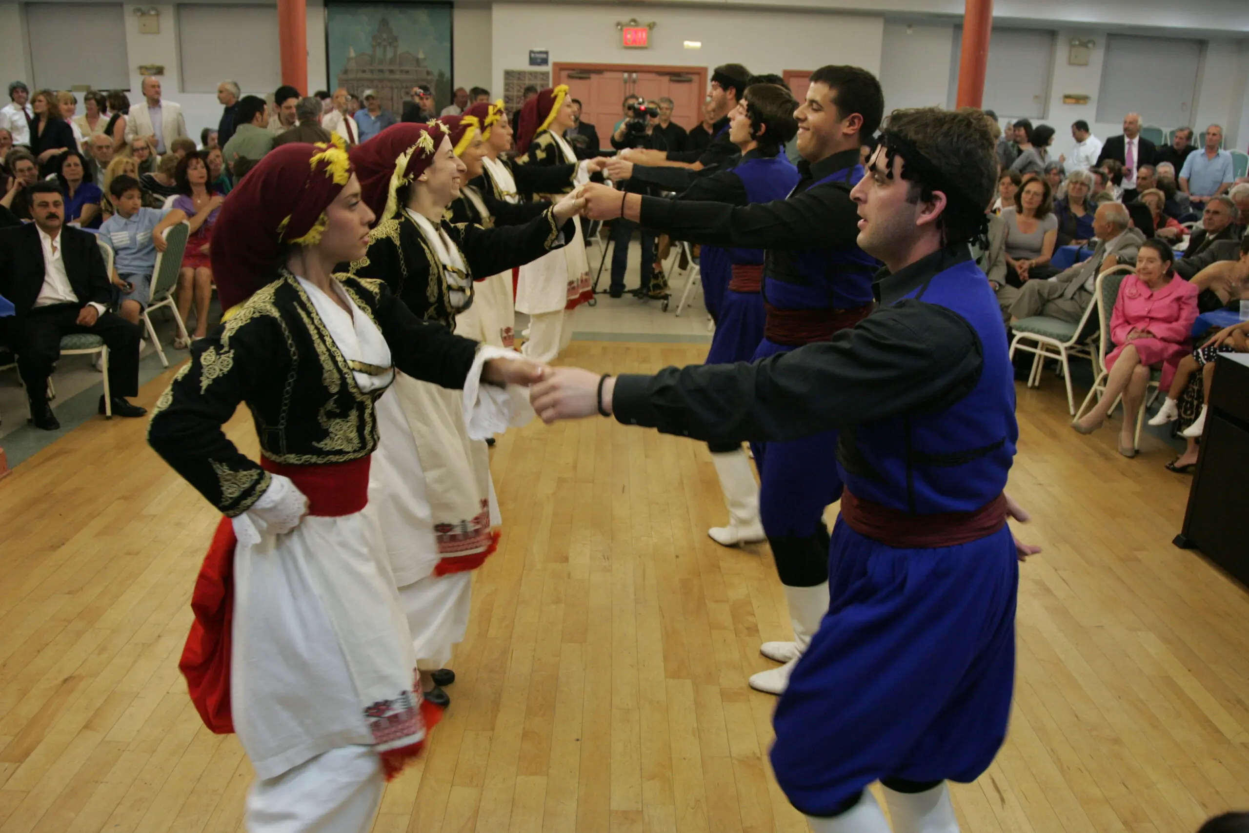 Three people at a formal event, one reading from a paper. People dressed in traditional attire performing a folk dance in a hall. People dancing in traditional attire at a cultural event indoors. A large group of people seated and standing in a spacious indoor event. Group in traditional Balkan folk costumes posing indoors. Three men dressed in traditional Balkan folk costumes during a cultural event. Three people at an award ceremony, one holding a plaque. Group holding a sign promoting harmony and rights in the 2003 elections. Woman in red speaking at a podium with choir in background. Choir performing indoors with conductor leading them. A choir group singing with a pianist accompanying them. Group dressed in traditional folk costumes performing a dance indoors. Four elderly people smiling together indoors, one woman with a pink shawl and crutches. Two elderly men shaking hands in a social gathering. Elderly man smiling warmly in a suit jacket. A group of people standing on a stage with banners behind them. Choir of elderly individuals singing indoors with banners behind them. Group of men in suits posing at a formal event. Two men in traditional attire performing a jump during a cultural dance. Man and woman holding an award plaque at an event. Group of people speaking at a podium with a microphone. Two women warmly greeting each other at a professional event. Group photo of choir members with two women holding an award. An elderly man and woman posing together indoors in front of a banner. Group of formally dressed people posing on stage with banners in background. Group photo of professionally dressed people at a Lions Club event. Four people holding a blue flag with a gold emblem indoors.