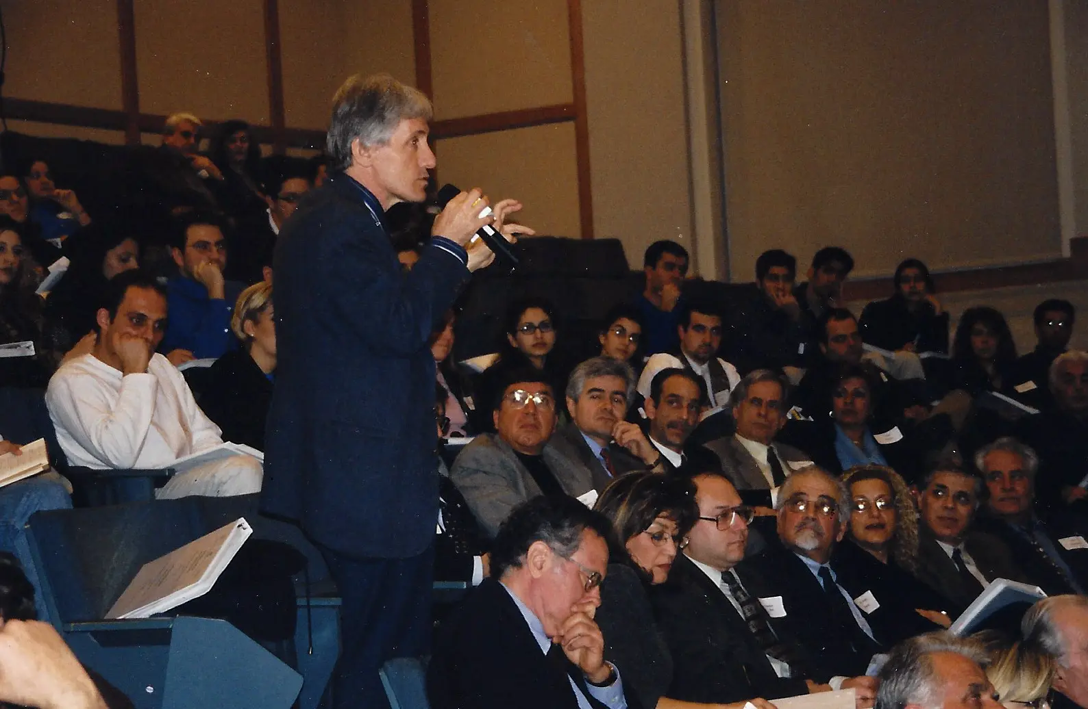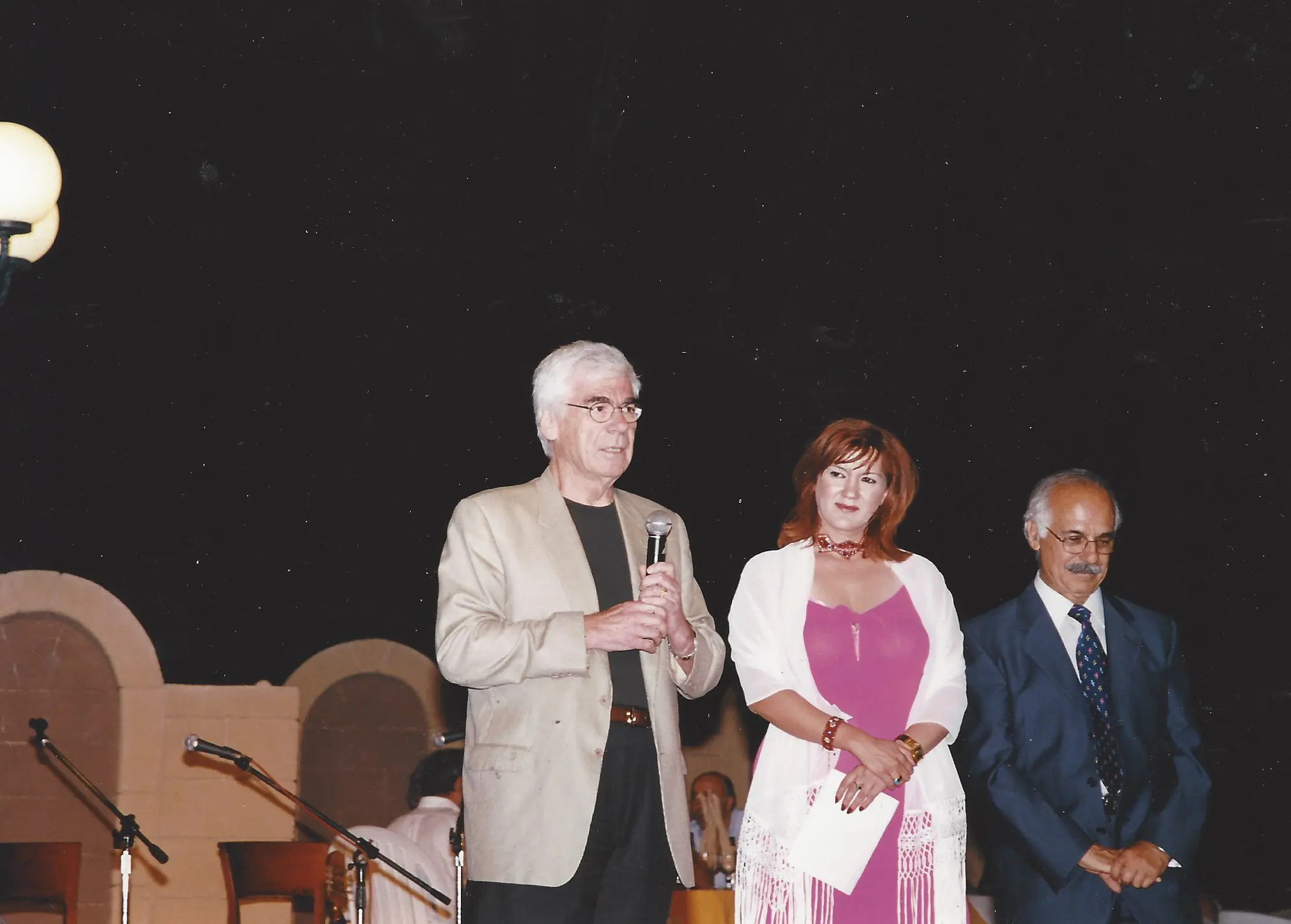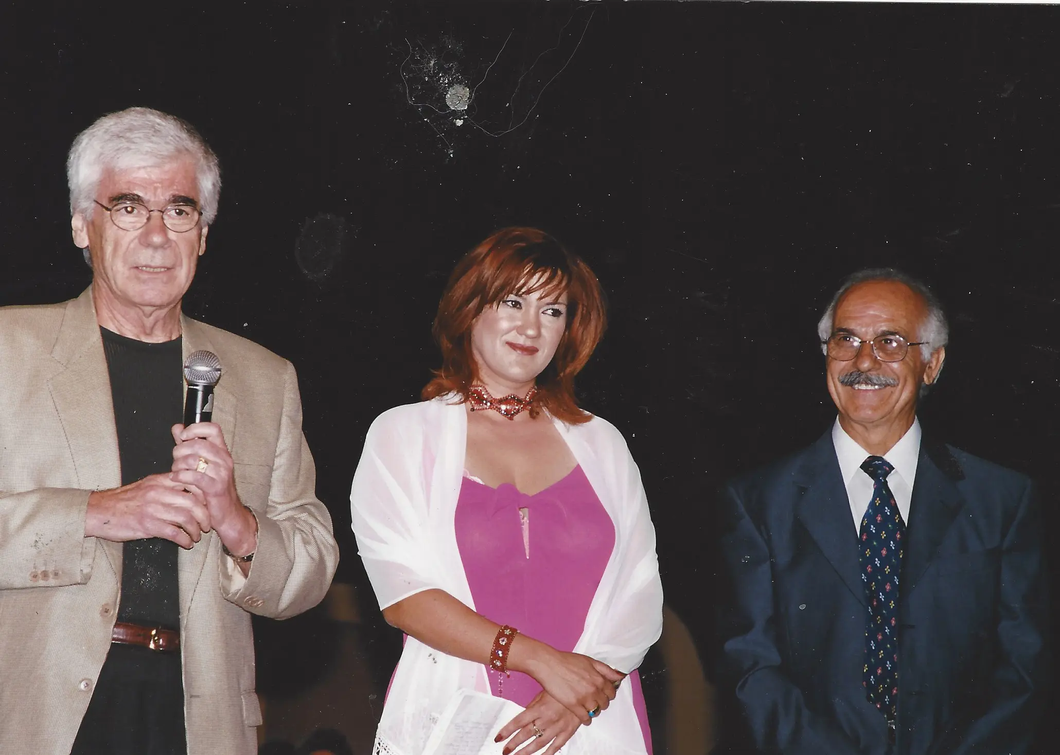 Three people at a formal event, one reading from a paper. People dressed in traditional attire performing a folk dance in a hall. People dancing in traditional attire at a cultural event indoors. A large group of people seated and standing in a spacious indoor event. Group in traditional Balkan folk costumes posing indoors. Three men dressed in traditional Balkan folk costumes during a cultural event. Three people at an award ceremony, one holding a plaque. Group holding a sign promoting harmony and rights in the 2003 elections. Woman in red speaking at a podium with choir in background. Choir performing indoors with conductor leading them. A choir group singing with a pianist accompanying them. Group dressed in traditional folk costumes performing a dance indoors. Four elderly people smiling together indoors, one woman with a pink shawl and crutches. Two elderly men shaking hands in a social gathering. Elderly man smiling warmly in a suit jacket. A group of people standing on a stage with banners behind them. Choir of elderly individuals singing indoors with banners behind them. Group of men in suits posing at a formal event. Two men in traditional attire performing a jump during a cultural dance. Man and woman holding an award plaque at an event. Group of people speaking at a podium with a microphone. Two women warmly greeting each other at a professional event. Group photo of choir members with two women holding an award. An elderly man and woman posing together indoors in front of a banner. Group of formally dressed people posing on stage with banners in background. Group photo of professionally dressed people at a Lions Club event. Four people holding a blue flag with a gold emblem indoors.