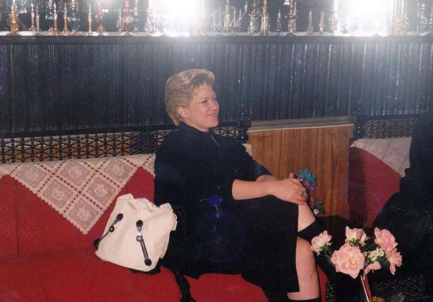 People conversing at an outdoor cafe table under an archway.