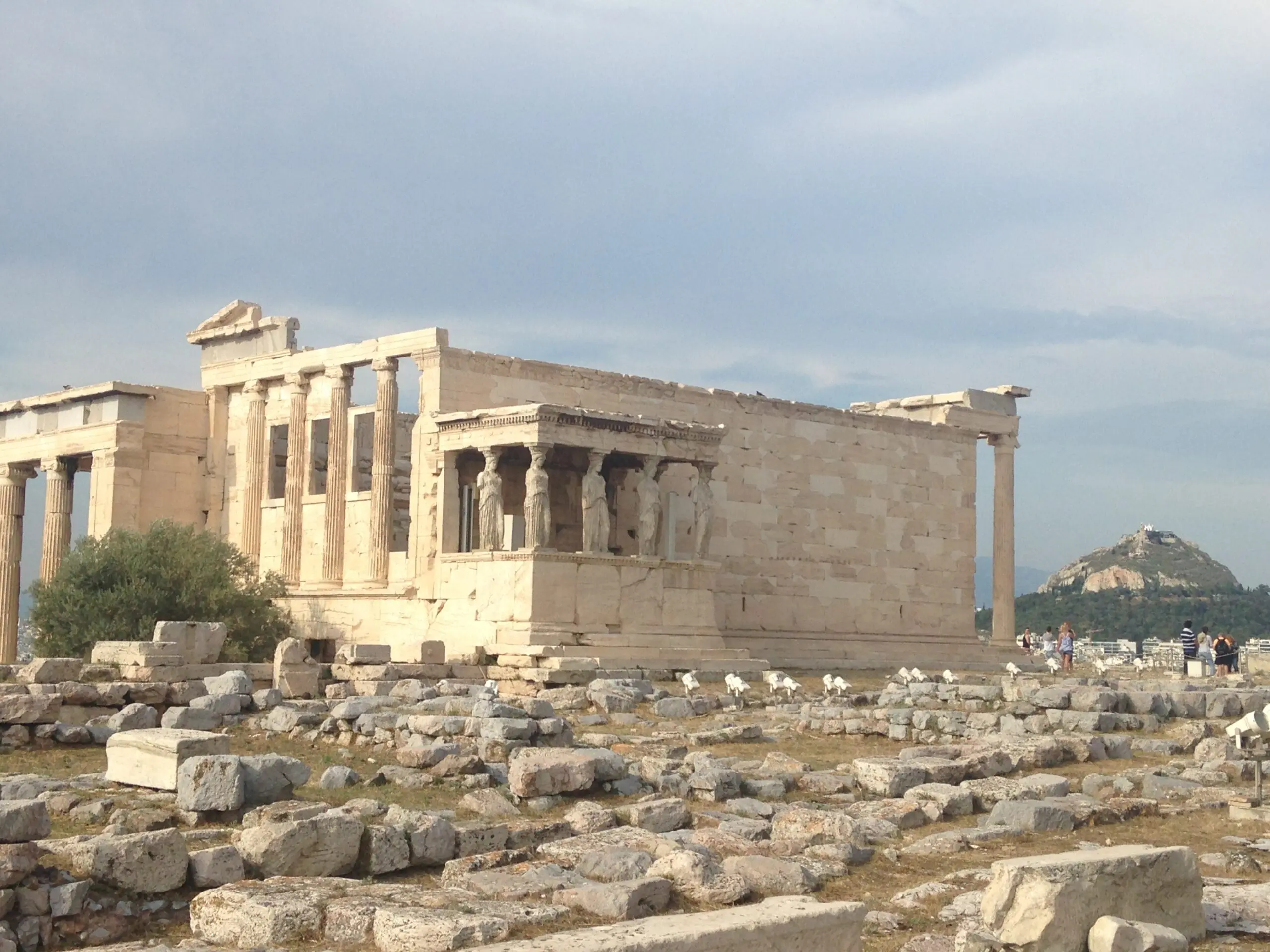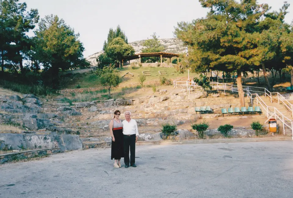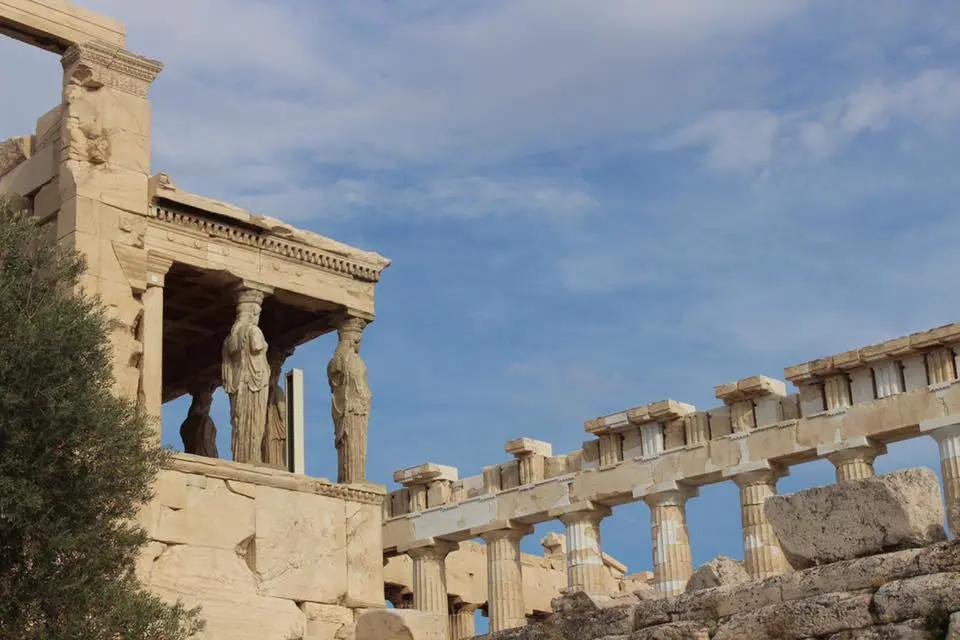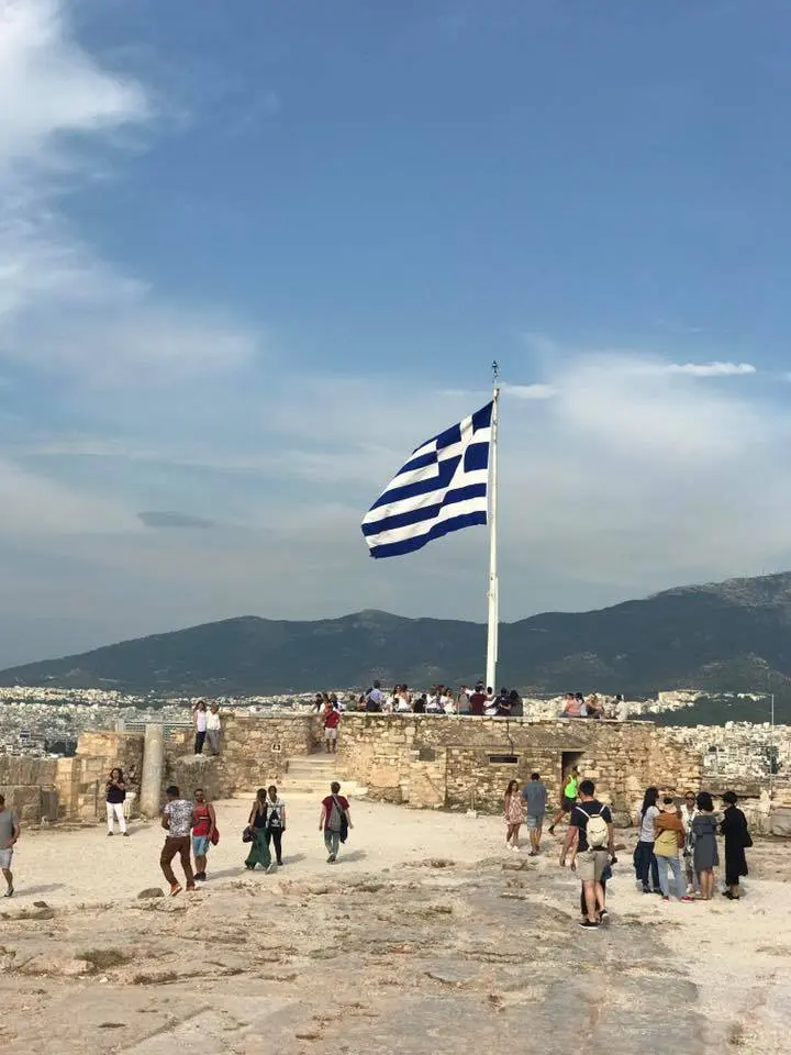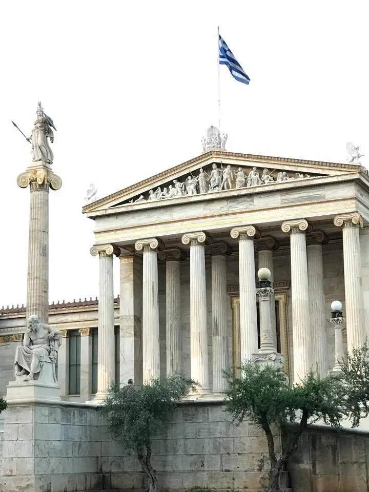 Greek flag waving over a historic site with visitors. A hand holding purple flowers near ancient temple ruins under cloudy sky. Old wooden cart with large spoked wheels. A group of people seated in a modern conference room, attentively listening. A group of people posing in a conference room with yellow chairs. Group in colorful traditional costumes posing indoors. Group in traditional cultural costumes posing on stairs. A group of people in colorful traditional costumes posing for a photo. A group of people in traditional costumes pose playfully indoors. Crowd gathered outside the Hellenic Parliament building in Athens under a partly cloudy sky. Group posing joyfully in front of ancient Greek ruins. Ancient Greek temple with tall columns and statues under a cloudy sky. Ancient-style museum building with statues and columns under a blue sky. Ancient ruins with stone columns under a partly cloudy sky and visitors exploring. Ancient stone columns stand against a cloudy sky in a historic ruin. A tattoo of Greek word Five women posing happily by a marina with boats in the background. Colorful framed artworks and souvenirs displayed on a blue wall. A quaint harbor passage framed by stone buildings and boats under a clear sky. Two fishing boats docked closely in a marina. A joyful group of young women posing together outdoors near a waterfront. A man and woman standing together near a water canal in a town. Woman smiling and posing with a horse outdoors. A couple standing together in a narrow cobblestone street with white walls. Old cannon displayed between two benches by the seaside. Stone pathway leading to a marina with boats and yachts under cloudy skies. Two birds perched on a ledge against a stone wall background. Ancient Greek temple ruins with statues under a clear sky. The Erechtheion temple on the Acropolis with Caryatids on the porch.