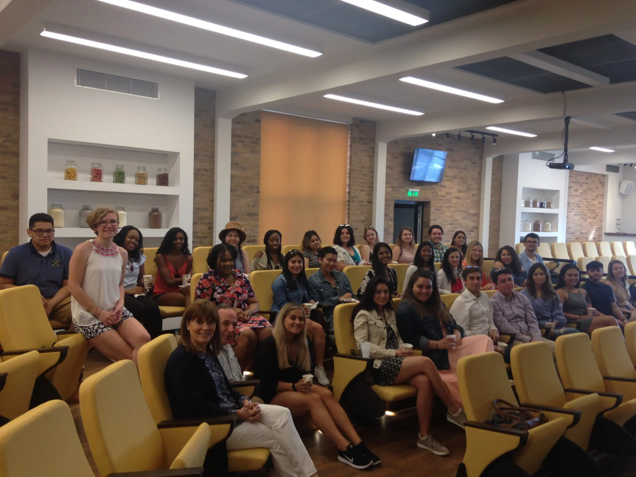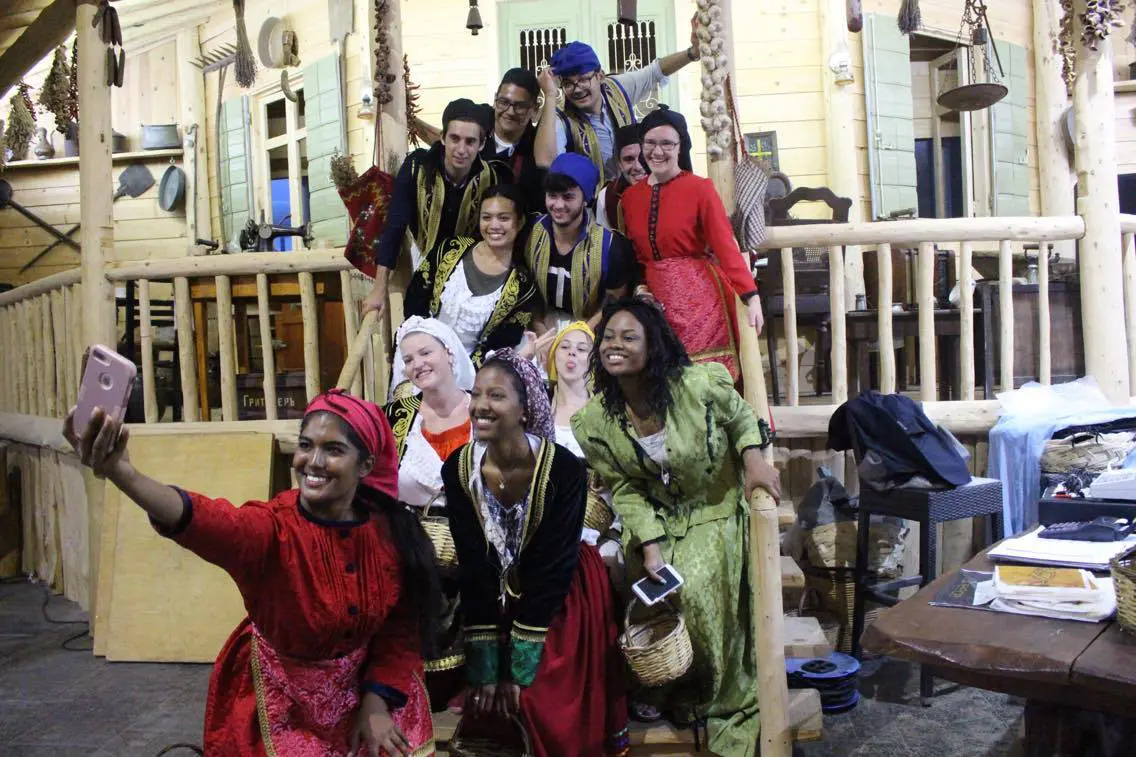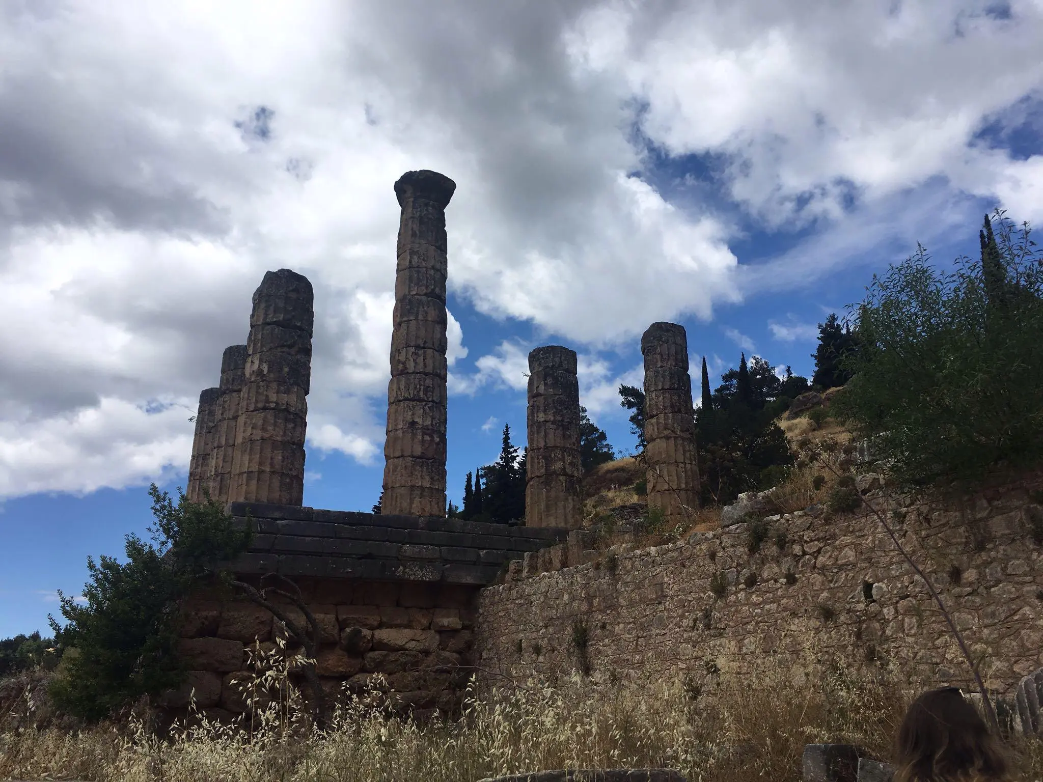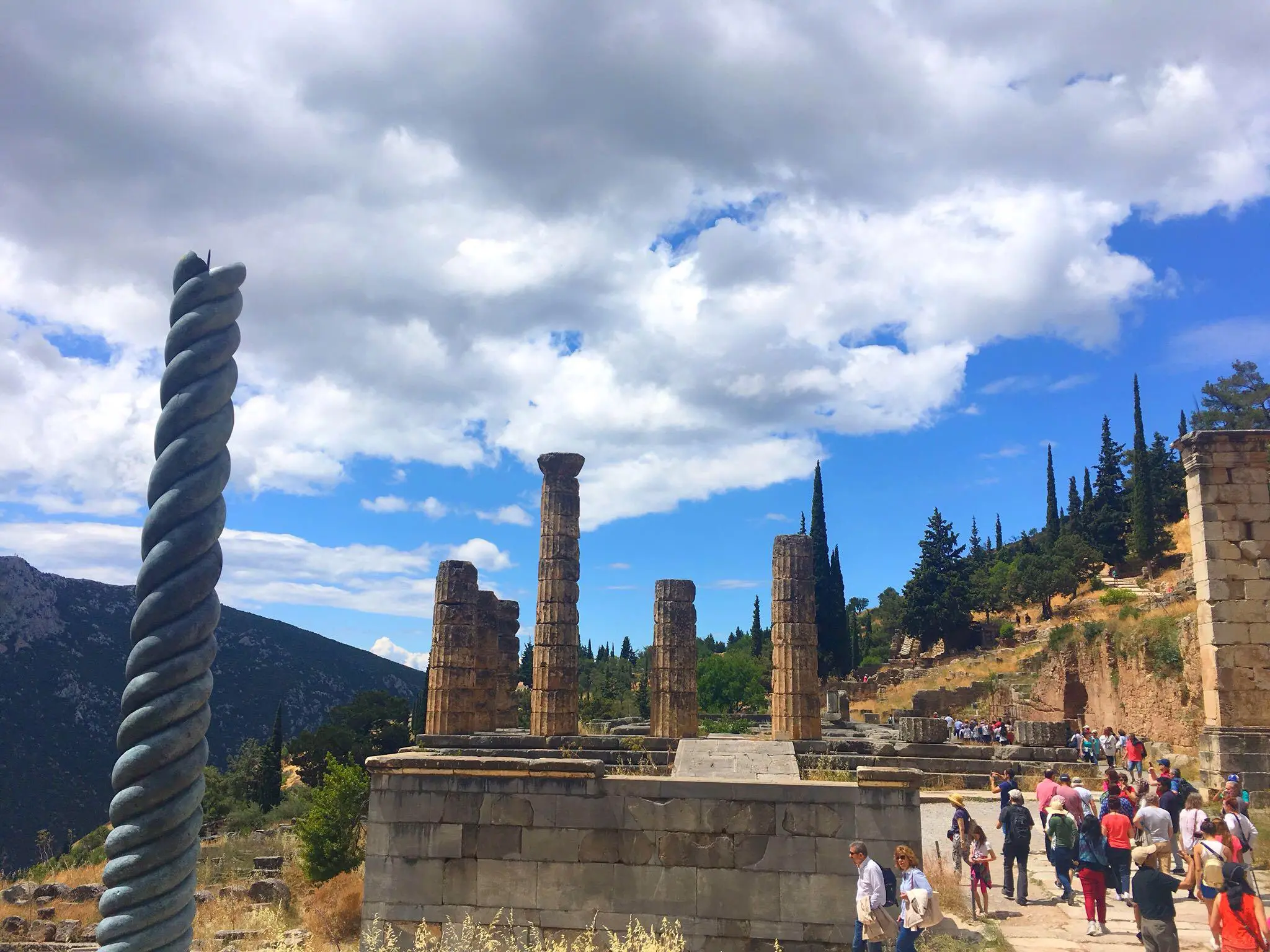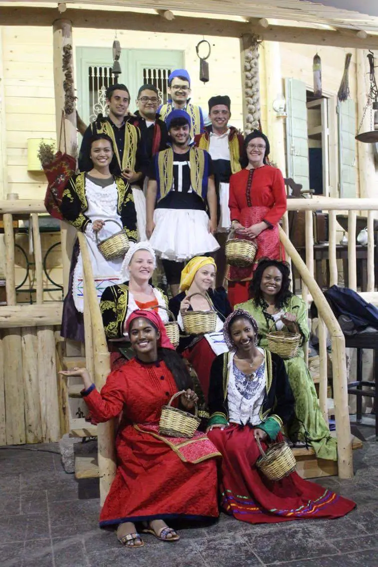 Group posing joyfully in front of ancient Greek ruins.