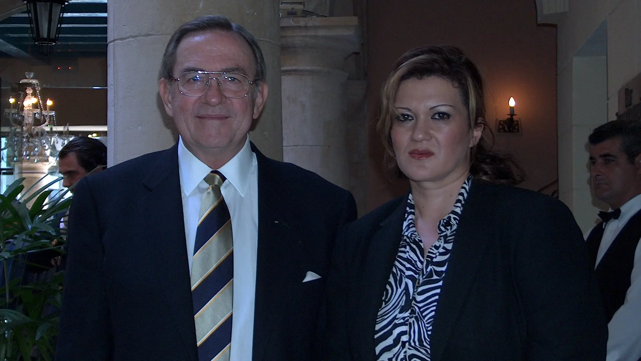 An elderly man and woman posing together indoors in front of a banner.
