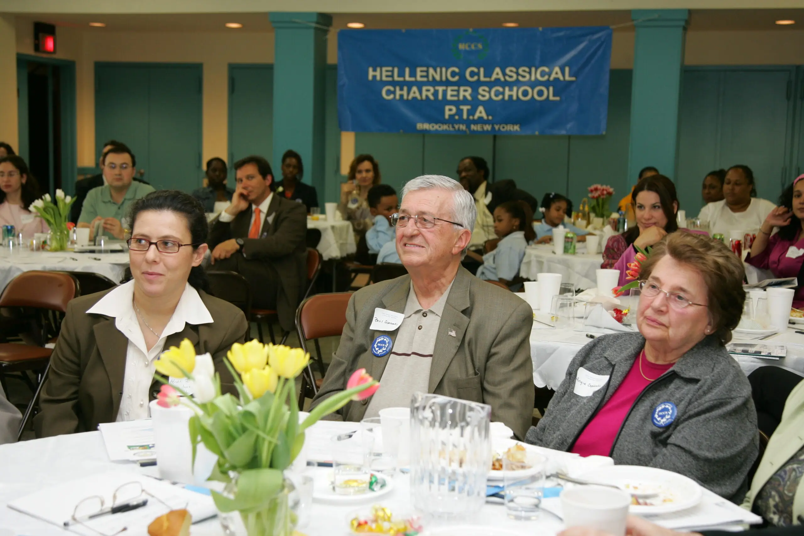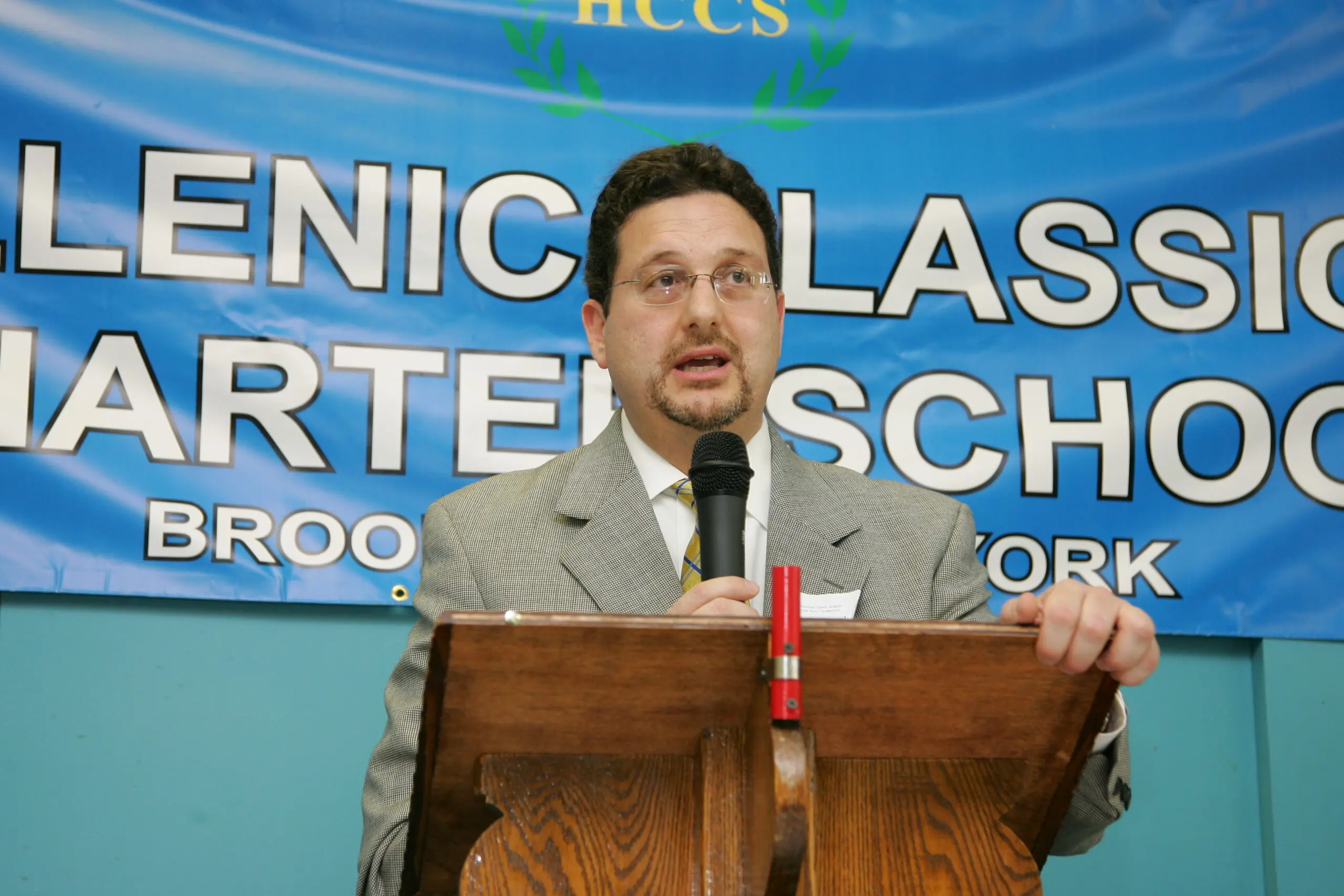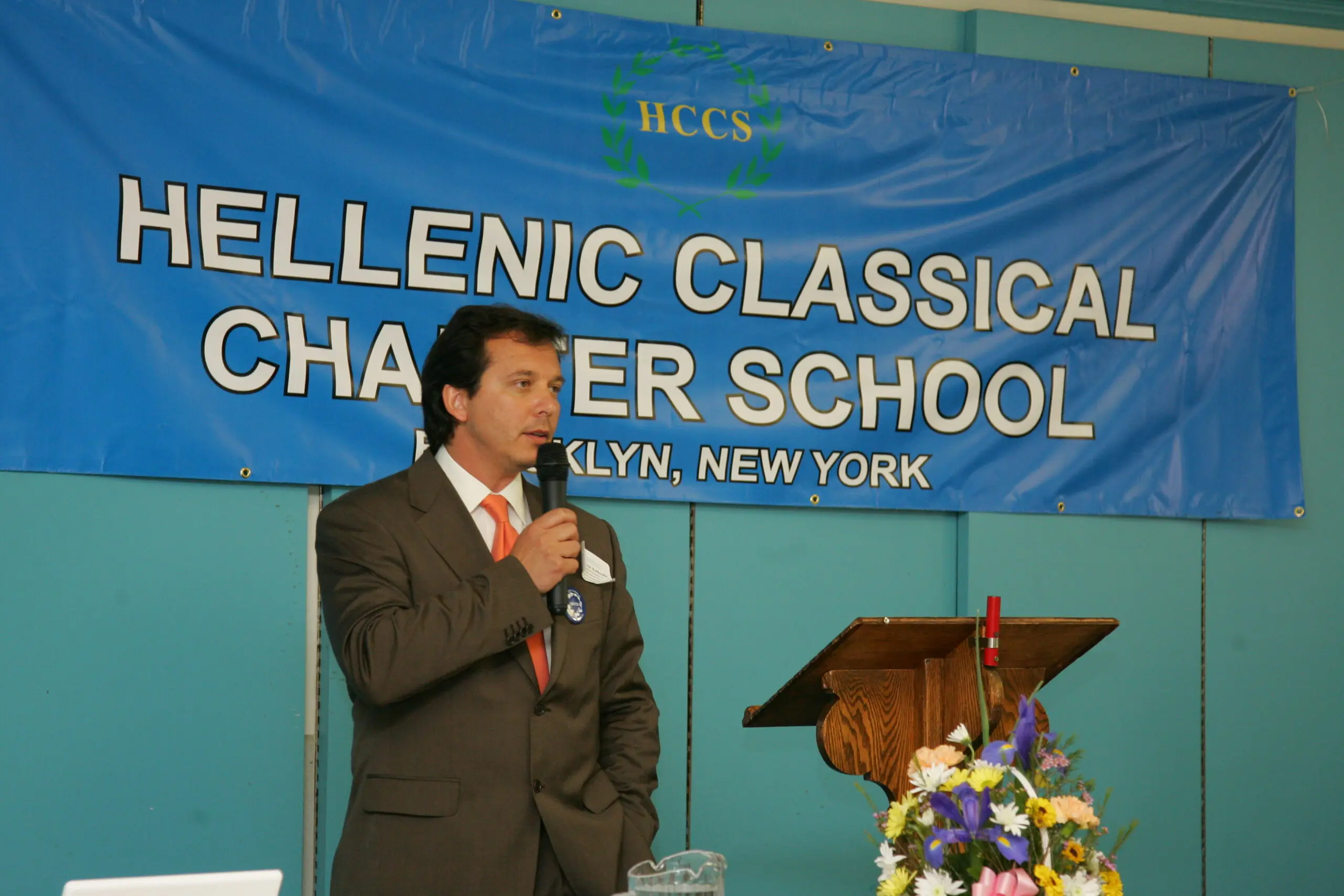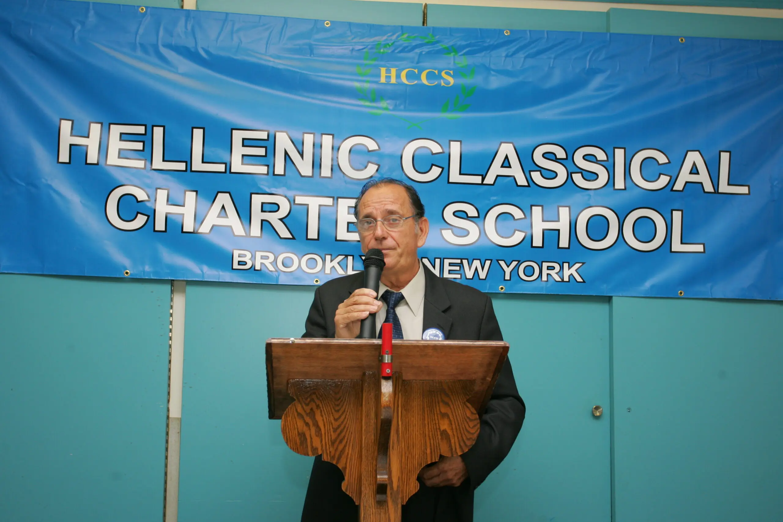 A man and woman in a serious conversation at a formal event. Portrait of an older man in a suit with a striped tie. Professional man in a suit and tie at an indoor event. Elderly man with white hair and mustache deep in thought. Woman speaking into a microphone at an event. Woman with sunglasses and bouquet smiling with a young girl in uniform. Two students stand outside The Fellers Classical Charter School building. Business meeting with presentations and discussions in a conference room. Man speaking at Hellenic Classical Charter School event in New York. Two individuals seated at a long table with a blue banner behind them. Thoughtful woman in white suit sitting at a table with a camera and pitcher. An elderly man speaking into a microphone at a formal event. A thoughtful man in a beige suit and patterned tie. A young girl with braided hair smiles gently. A young girl smiling warmly in a white polo shirt. Three smiling children posing together at a table. Group photo of teachers and officials at the Hellenic Classical Charter School event with trophies. Man speaking at a podium in front of a Hellenic Classical Charter Schools banner. An older man in a suit speaking at a podium with a microphone. A man in a suit speaking into a microphone at an event. A woman in a white blazer attentively listens, resting her chin on her hand. A man in glasses and a suit smiling gently. Woman speaking at a wooden podium with a microphone against a blue backdrop. People gathered at a formal event at Hellenic Classical Charter School. Group of children in school uniforms holding plants indoors. Man speaking at a podium during an event. Woman speaking at a podium in front of a school banner. Group photo of children and adults at a classical music school event. Speakers at the Hellenic Classical Charter School event in Brooklyn, NY. A man and woman in formal attire sitting closely together at a table. Group photo of children and adults at a classical studies event. A woman speaking into a microphone at an event. Elderly man in a suit stands in a colorful classroom.