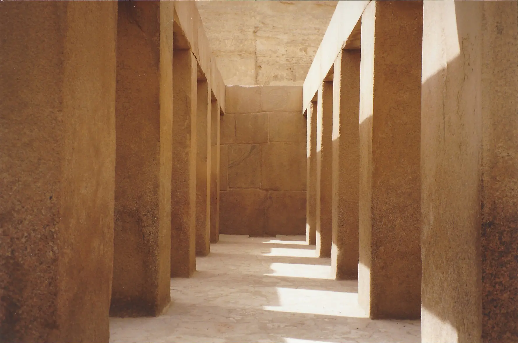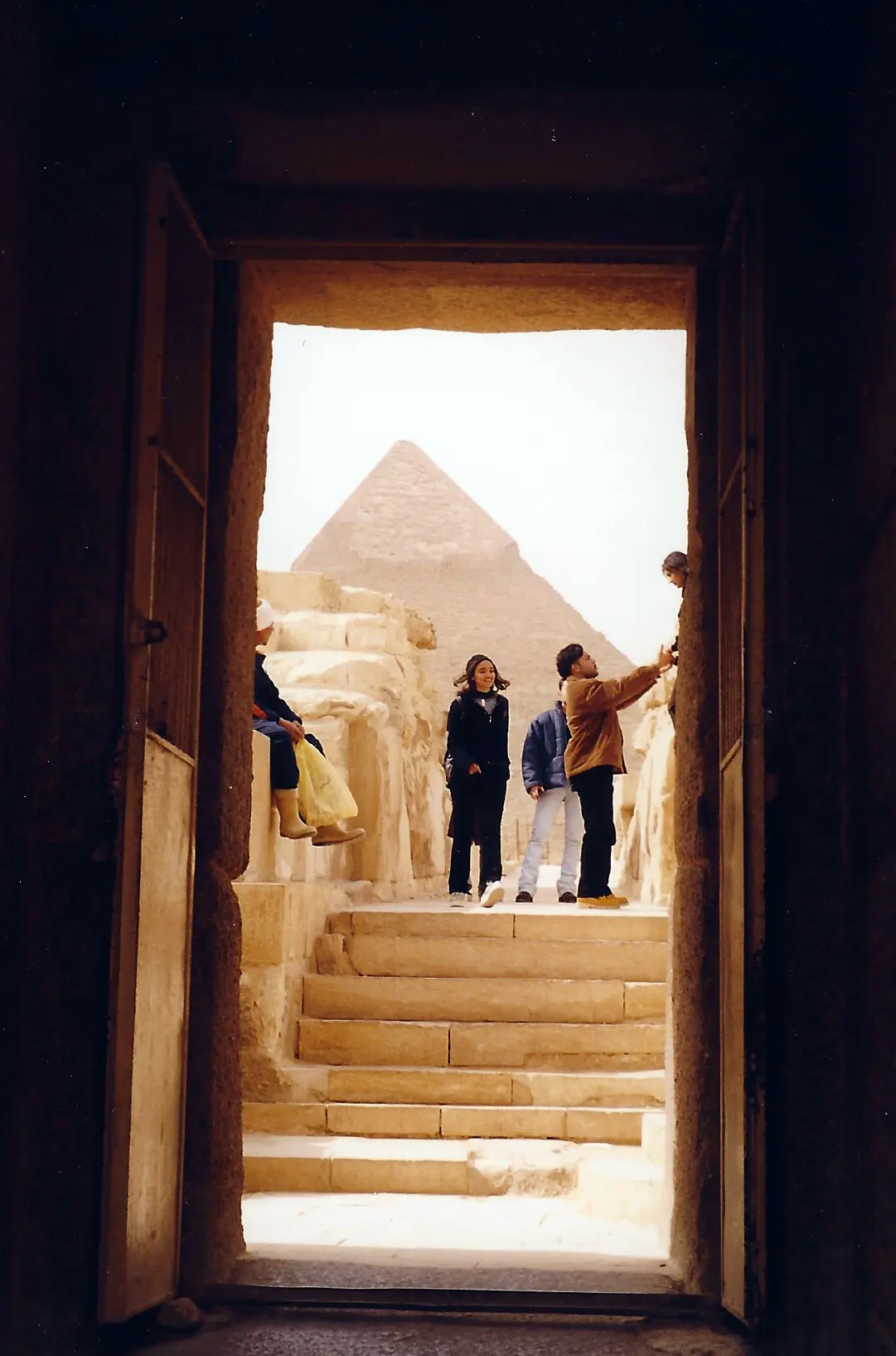 Three men seated with one dressed in religious attire speaking in front of red curtains. Side view of the Great Sphinx of Giza under a cloudy sky. Woman sitting on a couch with a white dog beside her. The Great Sphinx in front of the Pyramid of Khafre in Egypt. View of the Great Pyramid of Giza framed by an ancient doorway with tourists nearby. Sunlit corridor with tall pillars casting shadows. Tourists walking near the Great Pyramid of Giza and the Sphinx in Egypt. Person sitting on a camel near the Great Pyramid of Giza. Narrow, dimly lit tunnel with wooden support beams and a ladder leading downward. Person smiling warmly while sitting on stairs with arms crossed. Elderly woman in formal attire walking up stairs, accompanied by others.